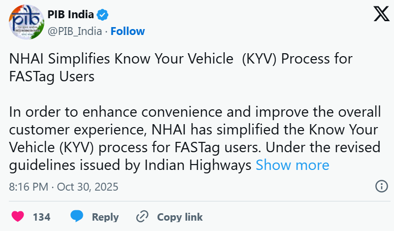 नेशनल हाईवे अथॉरिटी ऑफ इंडिया (NHAI) ने व्हीकल की KYV (नो योर व्हीकल) प्रक्रिया को आसान बना दिया है। नई गाइडलाइन के तहत यूजर्स को सिर्फ नंबर प्लेट और फास्टैग की फ्रंट फोटो अपलोड करनी होगी।