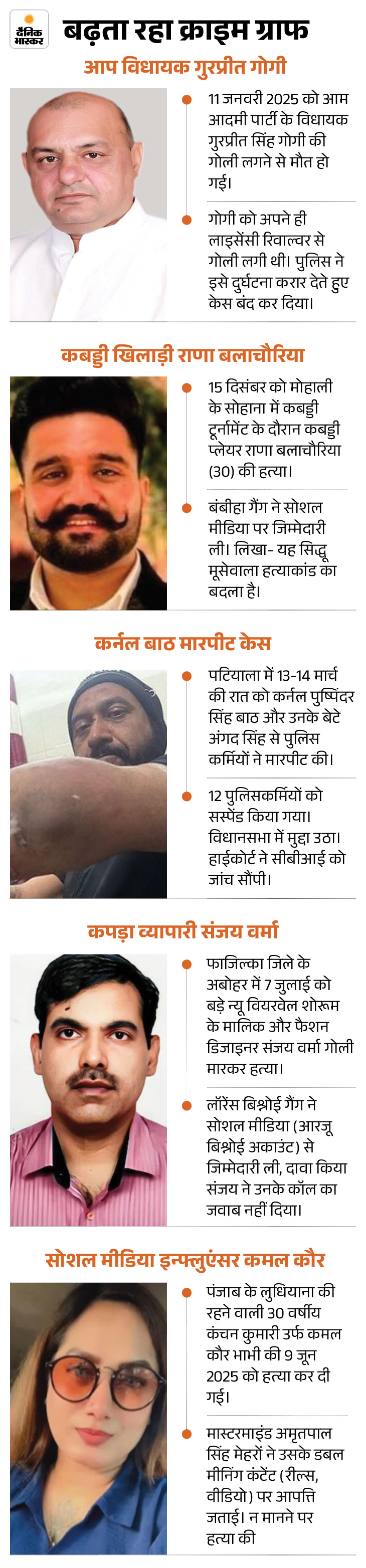 अबोहर के कपड़ा व्यापारी संजय वर्मा की हत्याः फाजिल्का जिले के अबोहर में 7 जुलाई को बड़े न्यू वियरवेल शोरूम के मालिक और फैशन डिजाइनर संजय वर्मा गोली मारकर हत्या। लॉरेंस गैंग ने हत्या की जिम्मेदारी ली, दावा किया संजय ने उनके कॉल का जवाब नहीं दिया। पुलिस ने दो आरोपियों को एनकाउंटर में मारा।