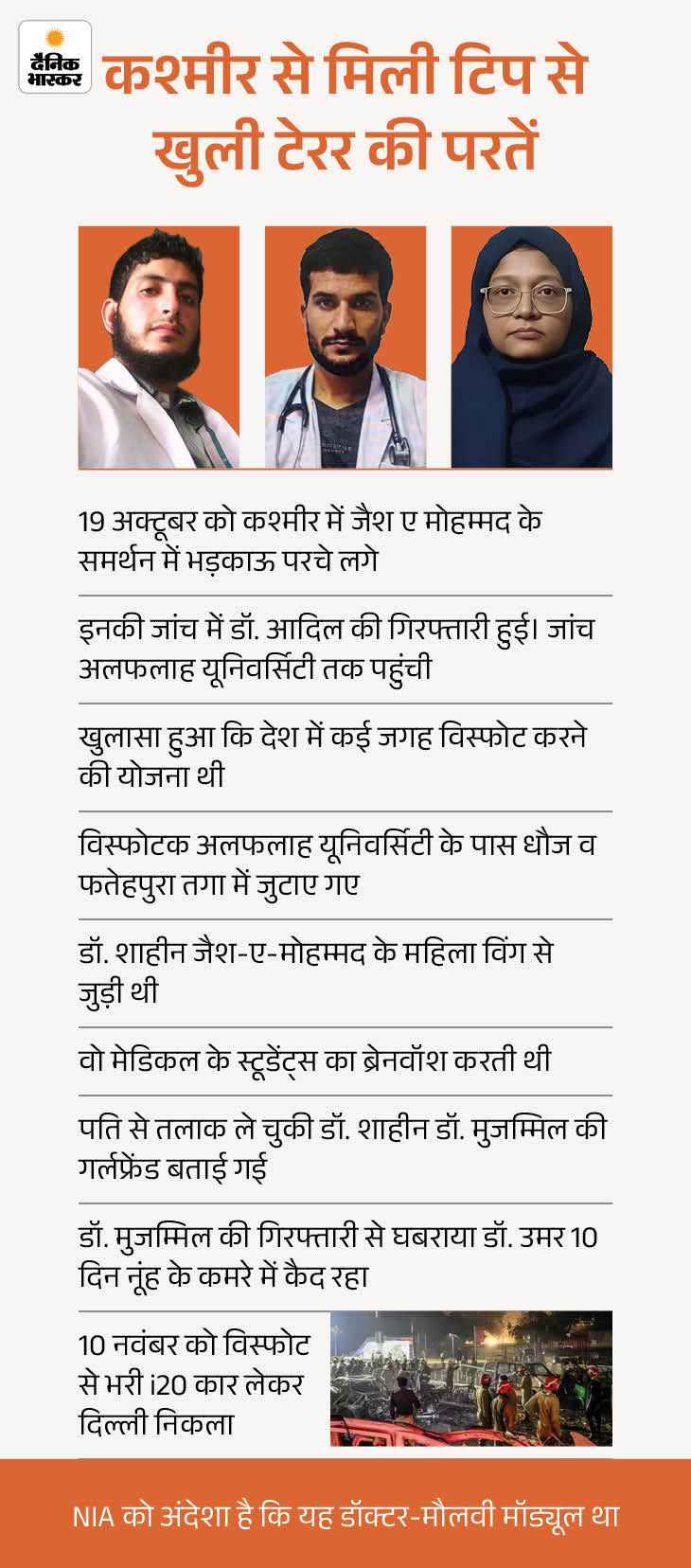 अल-फलाह यूनिवर्सिटी में दिल्ली ब्लास्ट की साजिश 9 व 10 नवंबर को फरीदाबाद के धौज व फतेहपुरा तगा गांवों में दो किराये के मकानों से 2900 किलो विस्फोटक मिला। अगले ही दिन दिल्ली के लाल किले के सामने डॉ. उमर नबी ने खुद को विस्फोटक से भरी कार समेत उड़ा लिया। 15 लोगों को मौत। जांच में राज खुला कि व्हाइट कॉलर टेरर मॉड्यूल का गढ़ फरीदाबाद की अल-फलाह यूनिवर्सिटी थी। डॉ. नबी इसी यूनिवर्सिटी से था। डॉ. शाहीन सईद, डॉ. मुजम्मिल शकील, डॉ. आदिल अहमद अरेस्ट हुए। अल-फलाह ट्रस्ट के चेयरमैन जवाद अहमद सिद्दीकी की गिरफ्तारी से गल्फ समेत विदेशी फंडिंग का पता चला।