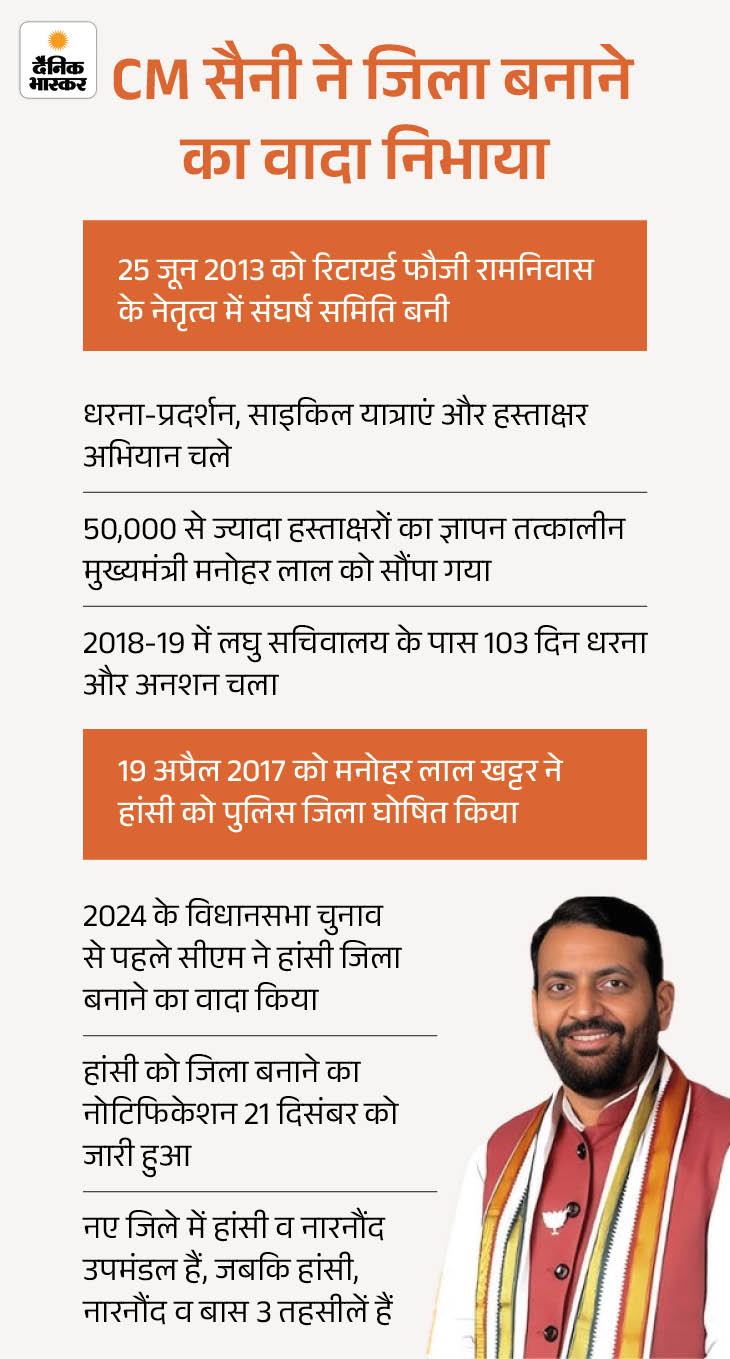 9 साल बाद हरियाणा को मिला 23वां जिला हांसी 16 दिसंबर को CM नायब सैनी ने जब रैली में हांसी को जिला बनाने की घोषणा की, तब लोगों ने खड़े होकर तालियां बजाई। इससे पहले 2016 में दादरी प्रदेश का 22वां जिला बनाया गया था। हांसी की तरह गोहाना, डबवाली, असंध भी जिला बनने की दौड़ में थे। हांसी को जिला बनाना भाजपा का राजनीतिक मास्टर स्ट्रोक माना जा रहा है। प्रदेश के सियासी इतिहास में अजब संयोग है कि राज्य में जिस भी मुख्यमंत्री ने नया जिला बनाया, अगले विधानसभा चुनाव में वह अपने बूते पार्टी को पूर्ण बहुमत नहीं दिला पाया।