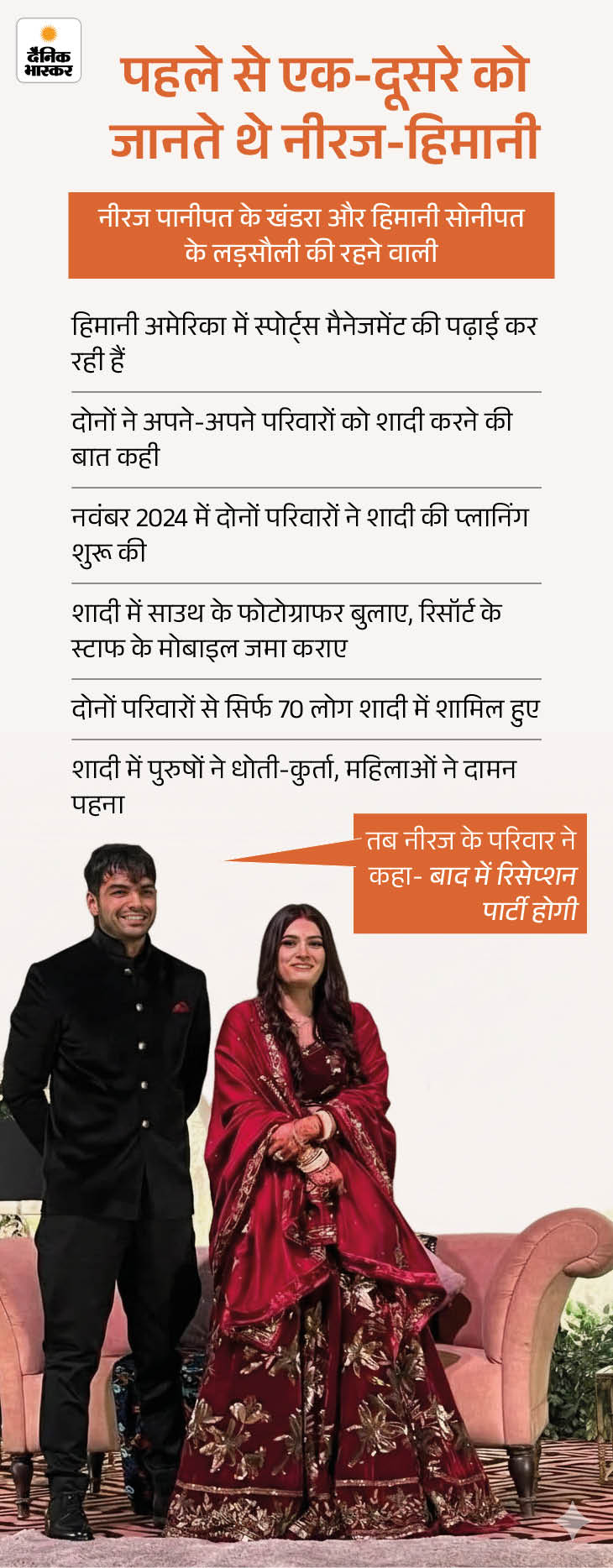 गोल्डन बॉय नीरज चोपड़ा की गुपचुप शादी 2025 की शुरुआत में जेवलिन थ्रोअर और ओलिंपिक गोल्ड मेडलिस्ट नीरज चोपड़ा की शादी ने सभी को चौंका दिया। पानीपत के नीरज ने सोनीपत की रहने वाली टेनिस प्लेयर हिमानी मोर से 16 जनवरी को हिमाचल के सोलन में शादी की। शादी समारोह में सिर्फ परिवार और करीबी लोग ही शामिल हुए। नीरज ने तर्क दिया कि गेम्स के बीजी शेड्यूल के चलते इस तरह प्रोग्राम किया गया। शादी के लगभग एक साल बाद नीरज और हिमानी की 3 रिसेप्शन पार्टी हुई। इसमें प्रधानमंत्री नरेंद्र मोदी भी शामिल हुए।