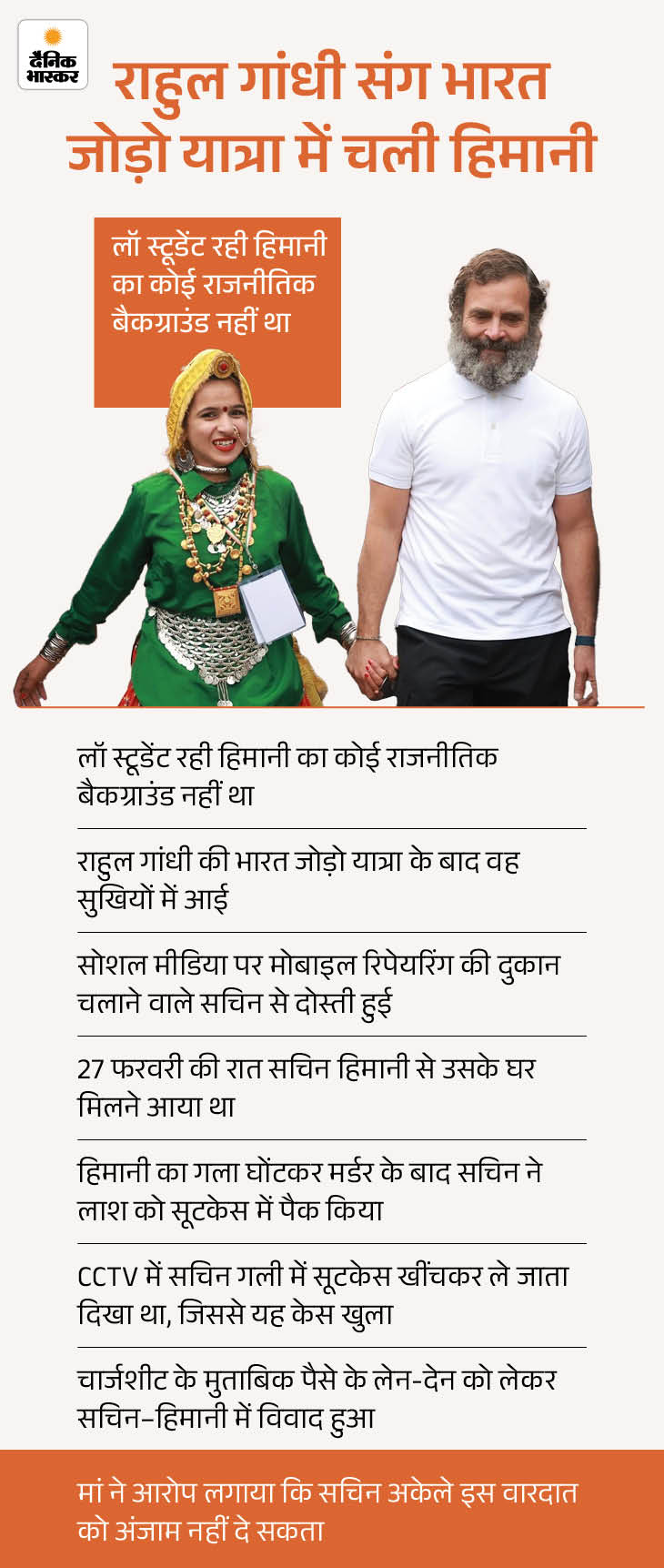 सूटकेस में मिली रोहतक की कांग्रेस नेत्री की लाश 1 मार्च को रोहतक में सांपला बस स्टैंड के पास झाड़ियों में सूटकेस मिला। जिसे खोला तो उसमें एक लड़की की लाश थी। लड़की की पहचान कांग्रेस नेत्री हिमानी नरवाल के तौर पर हुर्ठ। वह राजनीति में बड़ी तेजी से सीढ़ियां चढ़ रही थी। 5 मार्च को इस मामले में बहादुरगढ़ के सचिन उर्फ ढिल्लू की गिरफ्तारी हुई। जांच में सामने आया कि सचिन ने मोबाइल चार्जर की तार से गला घोंटकर हिमानी की हत्या की। दोनों के आपस में संबंध थे। सचिन 27 फरवरी की रात उससे मिलने आया था। इसी दौरान विवाद हुआ और मर्डर कर दिया। हिमानी के परिवार ने बरोदा से कांग्रेस विधायक इंदुराज नरवाल की भूमिका पर सवाल खड़े किए।