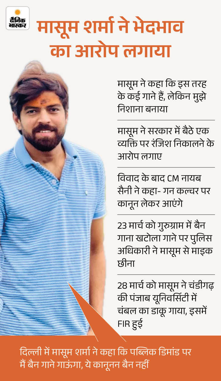 गन कल्चर वाले हरियाणवी गाने बैन मार्च 2025 में हरियाणा सरकार ने गन कल्चर और गुंडागर्दी को बढ़ावा देने का हवाला देते हुए यूट्यूब से हरियाणवी गाने बैन करने शुरू कर दिए। मासूम शर्मा, अमित सैनी रोहतकिया, अमनराज गिल, बीरू कटारिया, राज मावर, अंकित बालियान समेत कई अन्य सिंगरों के गाने शामिल थे। मासूम शर्मा के सबसे ज्यादा गाने बैन हुए, जिनमें “ट्यूशन बदमाशी”, “खटोला-2”, और “चंबल के डाकू” जैसे गाने शामिल हैं।