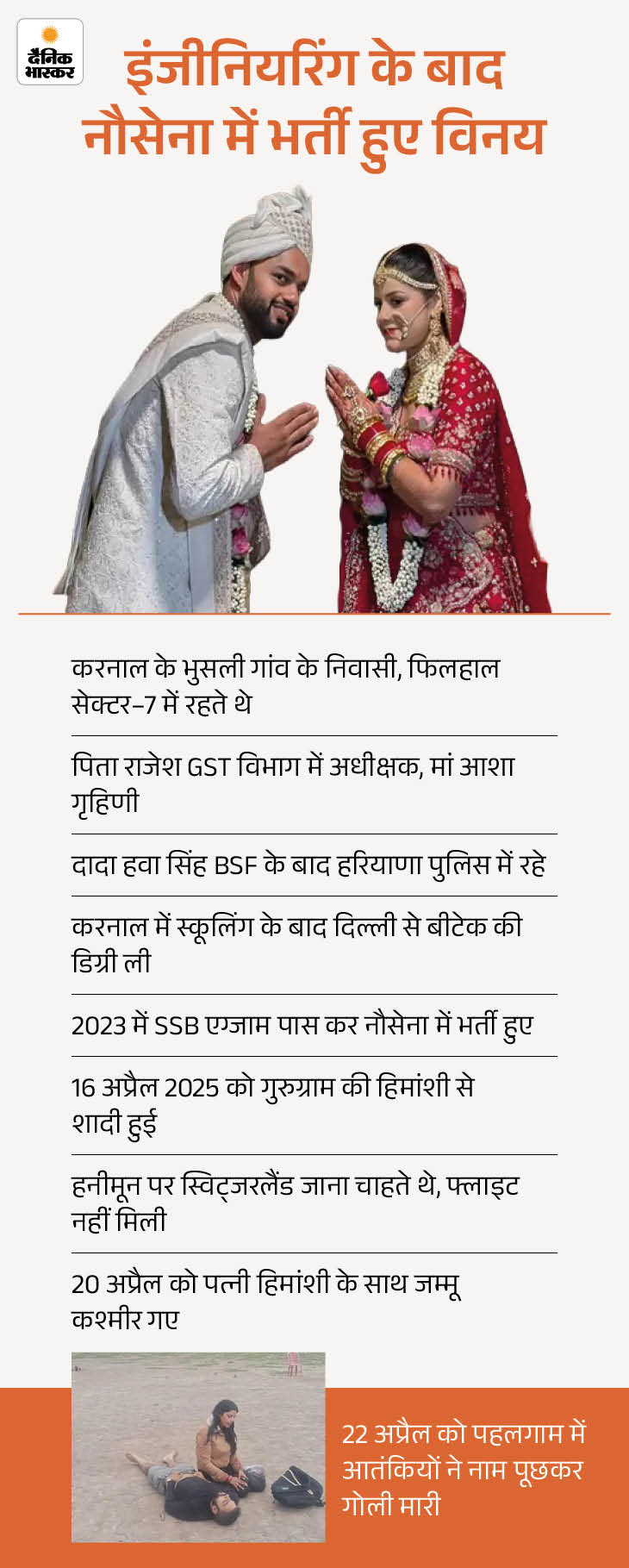 करनाल के लेफ्टिनेंट को आतंकियों ने गोली मारी, जिसने देश को झकझोरा 22 अप्रैल 2025 को जम्मू कश्मीर के पहलगाम में आतंकी हमला हुआ, इसमें करनाल के लेफ्टिनेंट विनय नरवाल को आतंकियों ने गोली मार दी जिसमें उनकी मौत हो गई। इस हमले में 26 लोगों की जान गई थी। सबसे पहले हमले की एक तस्वीर सामने आई जिसमें पति जमीन पर पड़ा और लाल चूड़ा पहने पत्नी सुध-बुध खोए पास बैठी दिखी। यह तस्वीर विनय और उनकी पत्नी हिमांशी की थी। दोनों की इस हमले से 6 दिन पहले यानी 16 अप्रैल को शादी हुई थी। दोनों हनीमून मनाने कश्मीर आए थे। 23 अप्रैल को करनाल में सैन्य सम्मान से विनय नरवाल का अंतिम संस्कार हुआ।