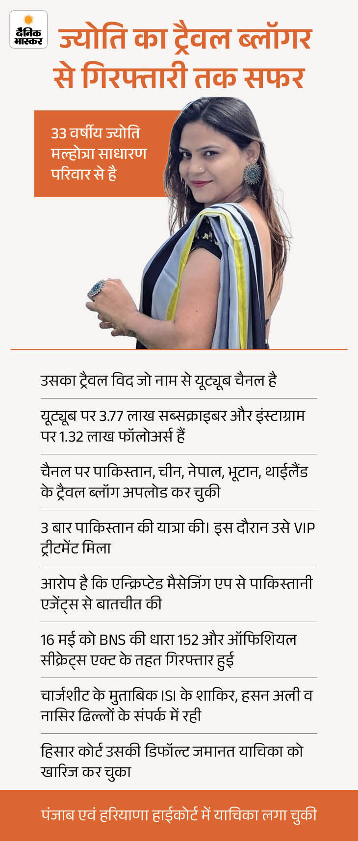 हिसार की यूट्यूबर ज्योति पाक की जासूसी के आरोप में गिरफ्तार 16 मई को पुलिस ने पाकिस्तान के लिए जासूसी के शक में हिसार की रहने वाली सोशल मीडिया इन्फ्लुएंसर ज्योति मल्होत्रा को गिरफ्तार किया। ज्योति पर आरोप है कि वो पाकिस्तानी इंटेलिजेंस के संपर्क में थी। उसकी पाकिस्तानी दूतावास के स्टाफर एहसान उर्र रहीम उर्फ दानिश के साथ तस्वीरें भी वायरल हुईं। दानिश के भारत से निकाला गया था। पुलिस के मुताबिक ज्योति ने कई बार पाकिस्तान की यात्रा की। उसके खिलाफ 2500 पेज की चार्जशीट पेश की गई। वह अभी जेल में बंद है।