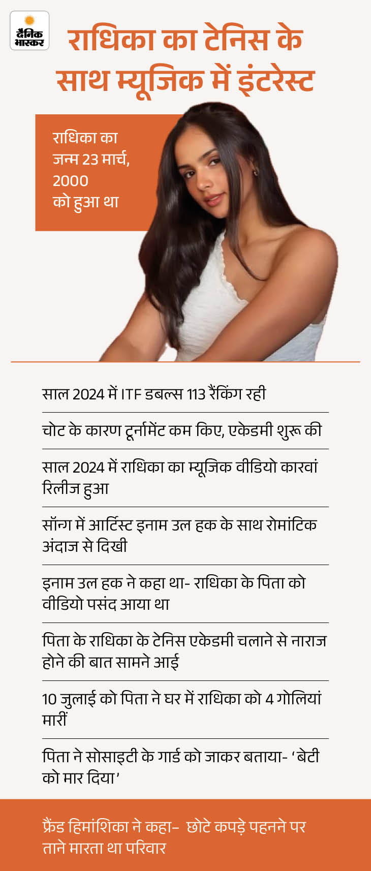 गुरुग्राम की टेनिस प्लेयर राधिका यादव की पिता ने हत्या की 10 जुलाई को गुरुग्राम के सुशांत लोक में अपने घर में इंटरनेशनल टेनिस प्लेयर राधिका यादव रसोई में खाना तैयार कर रही थीं, जब 4 गोलियां मारी गईं। कुल 5 फायर हुए थे। इस हाईप्रोफाइल मर्डर में राधिका के पिता दीपक यादव की गिरफ्तारी हुई। दीपक बड़ा रियल एस्टेट कारोबारी है। बताया गया कि पिता चाहते थे कि बेटी टेनिस एकेडमी बंद कर दे, जिसके लिए राधिका तैयार नहीं थी। दीपक यादव अभी जेल में बंदहै। इस मामले में पुलिस 10 अक्टूबर को 400 से ज्यादा पन्नों की चार्जशीट पेश कर चुकी है।