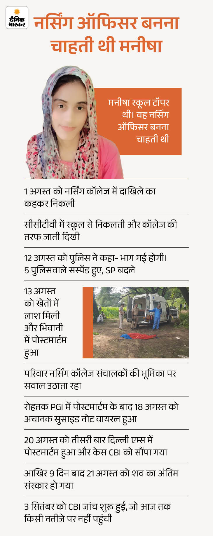 अनसुलझी मनीषा डेथ मिस्ट्री…एक शव का तीन बार पोस्टमॉर्टम 11 अगस्त को भिवानी के गांव ढाणी लक्ष्मण की 19 साल की लेडी टीचर मनीषा घर से प्लेवे स्कूल में पढ़ाने निकली। फिर घर नहीं लौटी। पिता संजय पुलिस में शिकायत दर्ज कराने पहुंचे तो जवाब मिला- कहीं भाग गई होगी। 13 अगस्त को लाश सिंघानी के खेतों में मिली। गले पर गहरे घाव थे। मर्डर का केस दर्ज हुआ। पहले भिवानी फिर रोहतक पीजीआई में शव का पोस्टमॉर्टम हुआ। 5 दिन बाद पुलिस ने दावा किया-मर्डर नहीं सुसाइड है। शरीर में पेस्टीसाइड के अंश मिले। रोष बढ़ा तो दिल्ली एम्स में पोस्टमॉर्टम करा केस CBI को सौंपा। गुत्थी अभी अनसुलझी है।