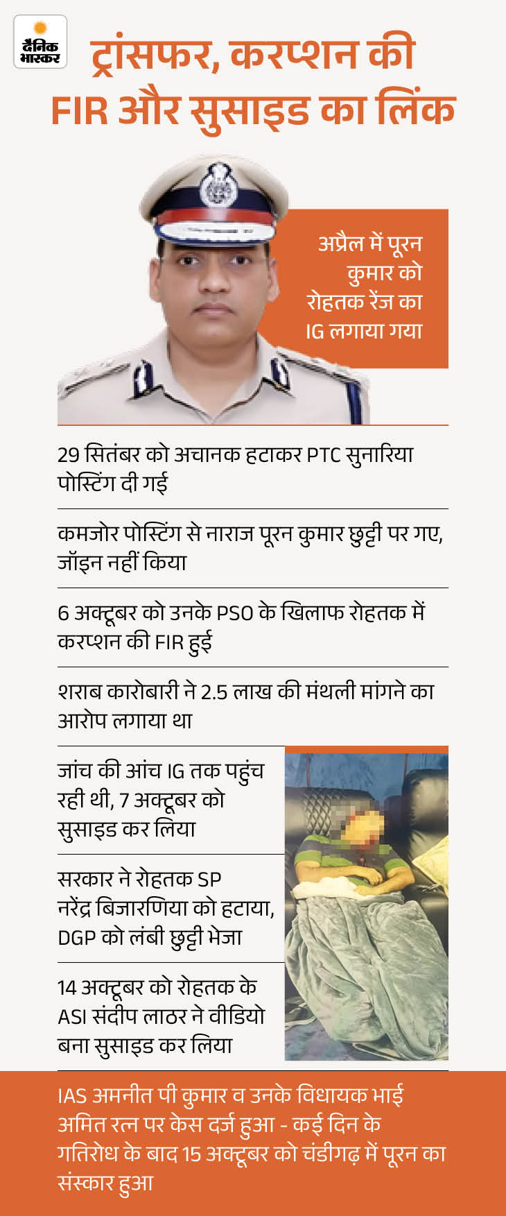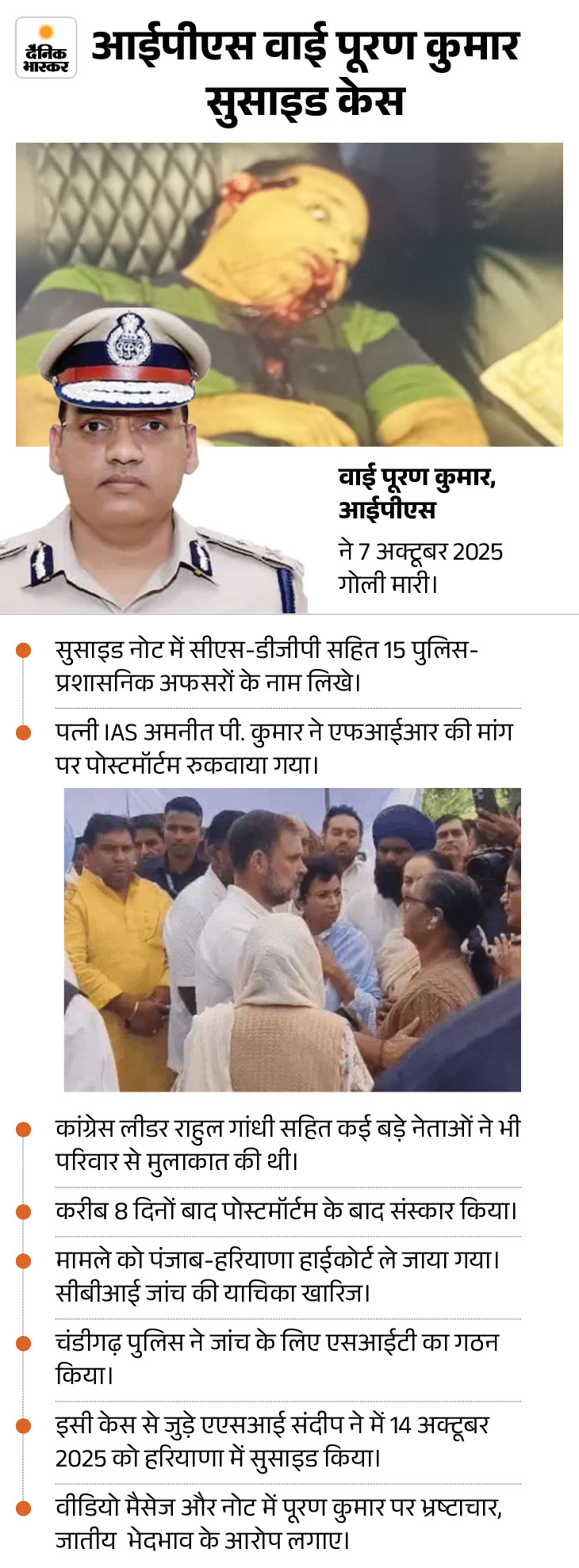 IPS पूरन कुमार ने सुसाइड किया…लास्ट नोट में 15 अफसरों के नाम7 अक्टूबर को सुबह-सुबह बुरी खबर आई। ये खबर थी हरियाणा कैडर के 2001 बैच के IPS अफसर वाई पूरन कुमार के सुसाइड की। जिन्होंने चंडीगढ़ में सेक्टर-11 स्थित आवास पर खुद की कनपटी पर गोली मारी। उस वक्त उनकी पत्नी IAS अफसर डॉ. अमनीत पी कुमार CM व सरकारी प्रतिनिधिमंडल के साथ जापान गईं थी। पूरन कुमार के पास 9 पेज का लास्ट नोट व वसीयत मिली। लास्ट नोट में तत्कालीन DGP शत्रुजीत कपूर समेत 15 IPS व IAS अफसरों का जिक्र था, जिन पर FIR हुई। सीनियर अफसरों पर मानसिक उत्पीड़न, जातीय भेदभाव और अपमान का आरोप था।