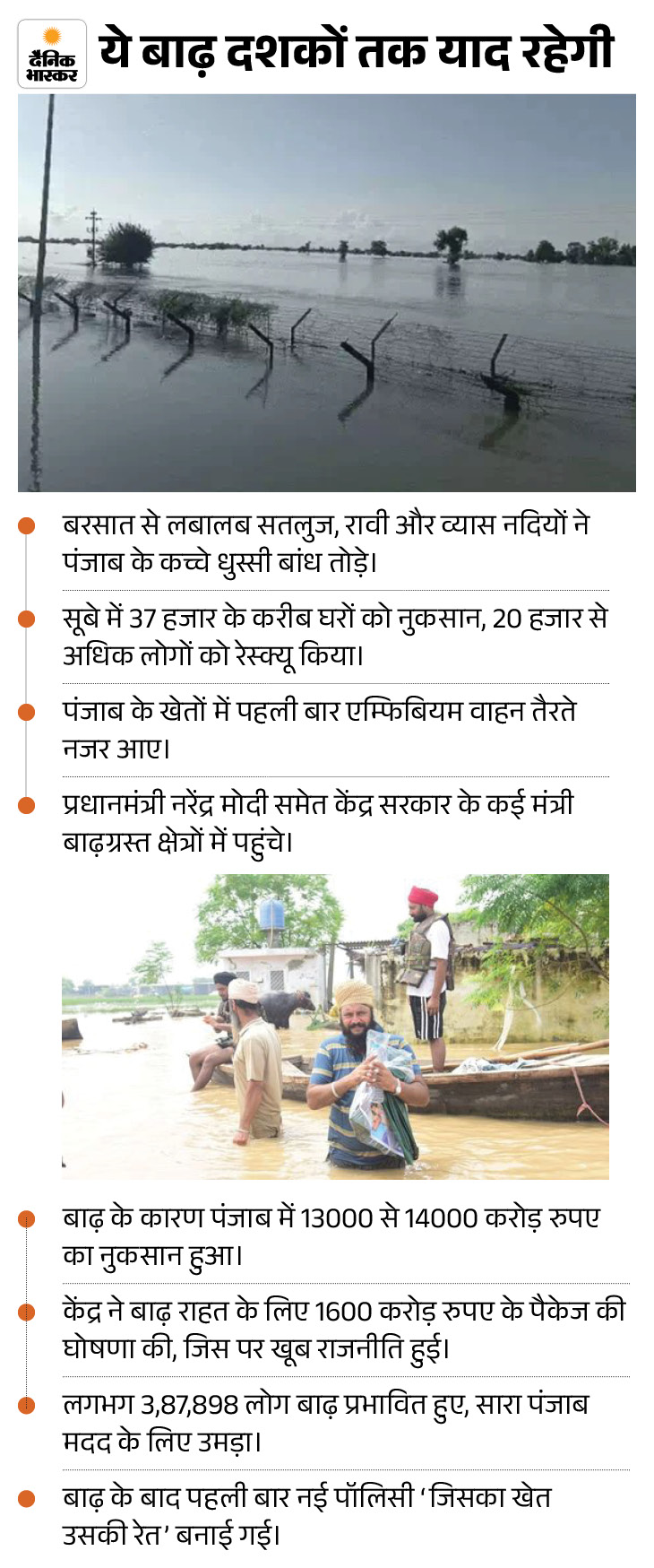 3. ऐतिहासिक बाढ़, 43 लोगों की जान गई पंजाब को साल 2025 बाढ़ के लिए भी याद रहेगा। अगस्त के अंत और सितंबर के शुरुआत में लगातार बरसात के बाद बाढ़ आई। AAP सरकार ने इसे इतिहास की सबसे बड़ी बाढ़ बताया। सभी 22 जिलों के 2500 गांव बाढ़ की चपेट में आ गए। इसमें 43 लोगों की जान चली गई जबकि 3.87 लाख लोग प्रभावित हुए।