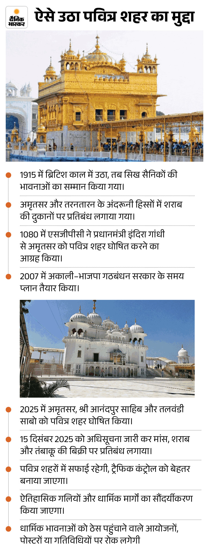 2. तीन पवित्र शहर, मीट-शराब, तंबाकू बिक्री बंद 45 साल बाद पंजाब में पवित्र शहरों की मांग पूरी हो गई। AAP सरकार ने खालसा की जन्मभूमि श्री आनंदपुर साहिब में विधानसभा का विशेष सत्र बुला प्रस्ताव पास करवाया। जिसके बाद अमृतसर की वॉल्ड सिटी, तख्त श्री दमदमा साहिब (तलवंडी साबो) तख्त श्री केसगढ़ साहिब (श्री आनंदपुर साहिब) पवित्र बना दिए गए। इनके विकास के लिए अलग से फंड आएगा। यहां मीट, शराब, तंबाकू, सिगरेट आदि उत्पादों की बिक्री पर प्रतिबंध रहेगा।