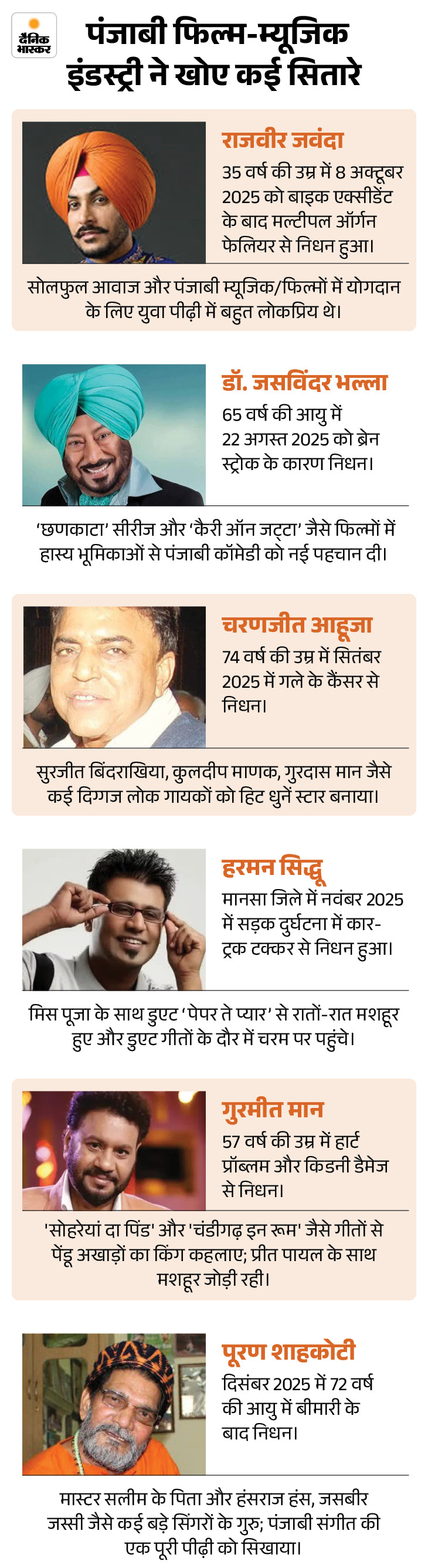 6. पंजाबी सिंगर-एक्टर खोए, जवंदा-भल्ला ने ज्यादा रुलाया साल 2025 में पंजाब ने अपने कई सिंगर-एक्टर और संगीतकार खो दिए। पंजाब के कॉमेडी किंग जसविंदर भल्ला का शुगर की बीमारी के चलते देहांत हो गया। वह पूरी उम्र लोगों को अपनी कॉमेडी से हंसाते रहे। उभरते एक्टर-सिंगर राजवीर जवंधा पंचकूला में सड़क दुर्घटना का शिकार हो गए। उनके लिए खूब अरदास-प्रार्थना हुई लेकिन मोहाली में मौत से जंग हार गए।