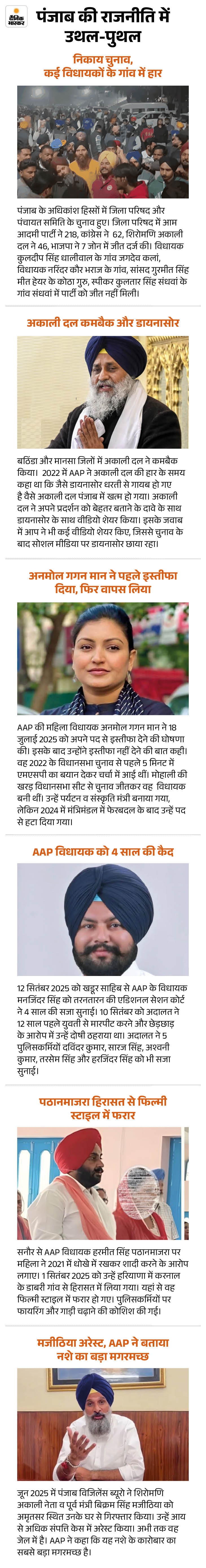 1. राजनीति: पूर्व मंत्री गिरफ्तार, आप MLA का अचानक इस्तीफा साल 2025 के उपचुनाव में AAP जीतती रही। पूर्व अकाली मंत्री बिक्रम सिंह मजीठिया की आय से अधिक संपत्ति के मामले में गिरफ्तार हुए। AAP की विधायक अनमोल गगन मान का अचानक इस्तीफा और फिर उसे वापस लेना भी सुर्खियों में रहा।