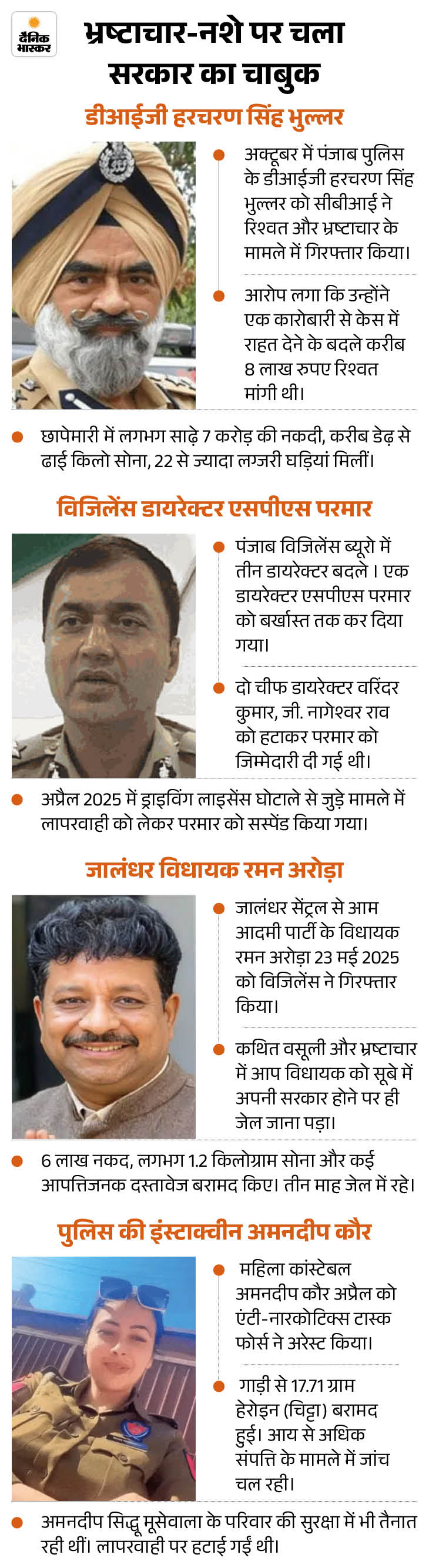 डीआईजी भुल्लर गिरफ्तारः घर से नकदी-सोना मिला: अक्टूबर में पंजाब पुलिस के डीआईजी हरचरण सिंह भुल्लर को सीबीआई ने रिश्वत और भ्रष्टाचार के मामले में गिरफ्तार किया। उनके घर और अन्य ठिकानों पर हुई छापेमारी में लगभग साढ़े 7 करोड़ की नकदी, करीब डेढ़ से ढाई किलो सोना, 22 से ज्यादा लग्जरी घड़ियां, महंगी गाड़ियां (मर्सिडीज, ऑडी) से जुड़े दस्तावेज, 108 बोतल विदेशी शराब, हथियार और गोलियां बरामद हुईं।