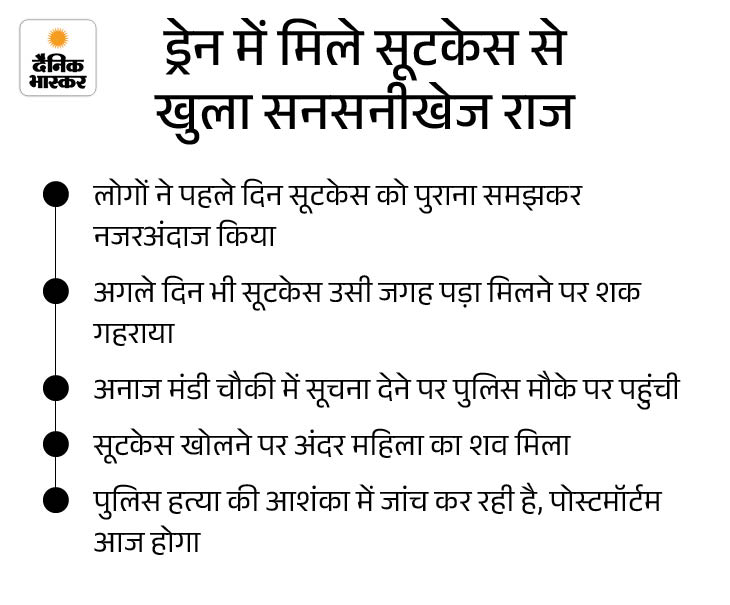 लोग बोले- सोचा किसी ने पुराना सूटकेस फेंका आसपास के डेरे ढाणियों में रहने वाले लोगों ने बताया कि सूटकेस तो उन्होंने एक दिन पहले ही देख लिया था, लेकिन शुरुआत में उन्हें लगा कि किसी ने यह फटा पुराना सूटकेस ड्रेन में फेंका हुआ है। पानी के साथ आगे निकल जाएगा, इस कारण वे इसे इग्नोर करके चले गए, लेकिन अगले दिन भी सूटकेस वहीं पर पड़ा मिला। अगर यह खाली होता तो गंदे पानी में बहकर उस जगह से थोड़ा बहुत आगे जा सकता था, लेकिन सूटकेस उसी जगह पर रहा।