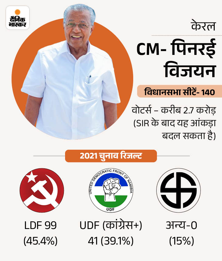 वहीं, BJP अब तक केरल में एक भी विधानसभा सीट नहीं जीत पाई है। पिछले लोकसभा चुनाव में यहां उसने त्रिशूर लोकसभा सीट जीती थी। इसके अलावा दिसंबर 2025 में भी BJP ने पहली बार त्रिवेंद्रम (तिरुवनंतपुरम) नगर निगम का चुनाव जीता।