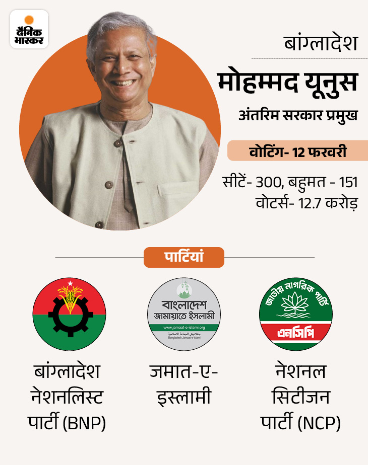 बांग्लादेश: 35 साल बाद नया PM मिलेगा शेख हसीना की तख्तापलट के बाद देश में पहली बार चुनाव हो रहे हैं। शेख हसीना भारत भागकर आ गई हैं और उनकी पार्टी अवामी लीग के चुनाव लड़ने पर बैन लगा दिया गया।
