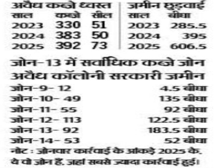 जेडीए रीजन में सरकारी जमीन पर कब्जे बढ़ते जा रहे हैं। जेडीए ने पिछले तीन साल (2023 से 2025) में 1287 बीघा जमीन भूमाफिया से मुक्त करवाई है। सबसे ज्यादा 606 बीघा जमीन 2025 में छुड़वाई। प्रवर्तन शाखा के आंकड़ों के अनुसार जेडीए जोन-10, 11, 12, 13 और 14 म