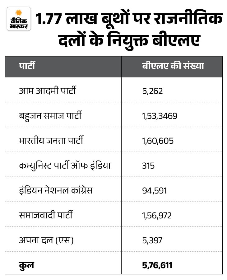 प्रदेश के 1.77 लाख बूथों पर 6.75 लाख बीएलए तैनात प्रदेश के राजनीतिक दल SIR को लेकर कितने सजग हैं, इसका अंदाजा BLA (बूथ लेवल एजेंट) की संख्या से लगाया जा सकता है। SIR प्रक्रिया के बाद प्रदेश के 1.77 लाख बूथों पर विभिन्न राजनीतिक दलों के करीब पौने 6 लाख BLA चुनाव आयोग की मदद के लिए सक्रिय हैं।