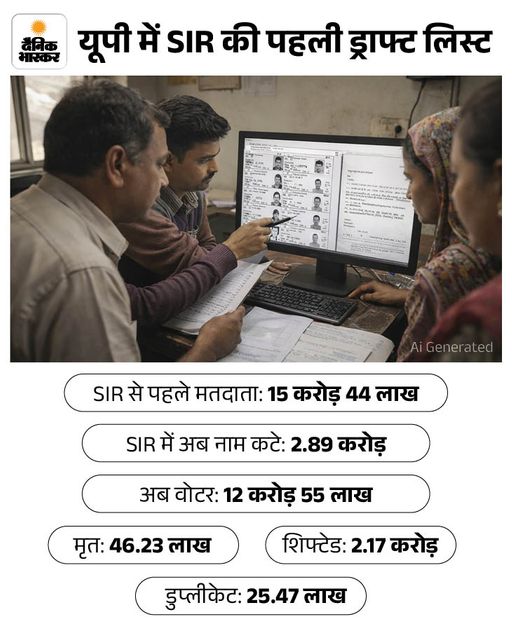 यूपी में SIR की ड्राफ्ट लिस्ट जारी हो गई है। इसमें 2.89 करोड़ (18 फीसदी) नाम कट गए हैं। सबसे ज्यादा राजधानी लखनऊ के वोटरों के नाम कटे हैं। यहां 30.05 फीसदी तक वोट कट गए। पहले यहां 39.94 लाख वोटर थे, अब 27.94 लाख ही बचे हैं। यानी करीब 12 लाख वोटरों के नाम कटे।
