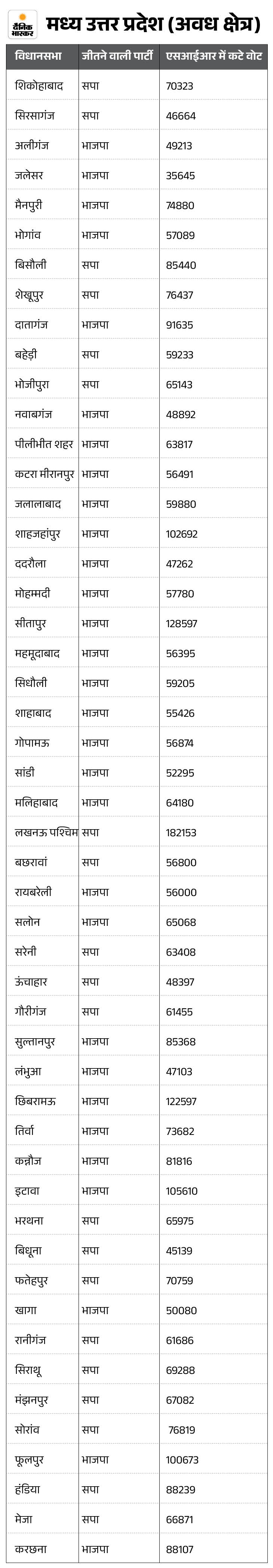 अवध में भाजपा-सपा दोनों पर पड़ेगा असर मध्य यूपी (अवध) क्षेत्र की 50 सीटों पर जीत–हार का मार्जिन 10 हजार से कम था। यहां सीधी लड़ाई सपा बनाम भाजपा की थी। इनमें 30 सीटों पर भाजपा, जबकि 20 सीटों पर सपा को जीत मिली थी। इस बेल्ट में लोधी, मौर्य, कुर्मी और यादव जैसी ओबीसी जातियों के वोटरों का दबदबा है। एसआईआर के बाद यहां दोनों दलों के चुनावी समीकरण प्रभावित होने की संभावना है।