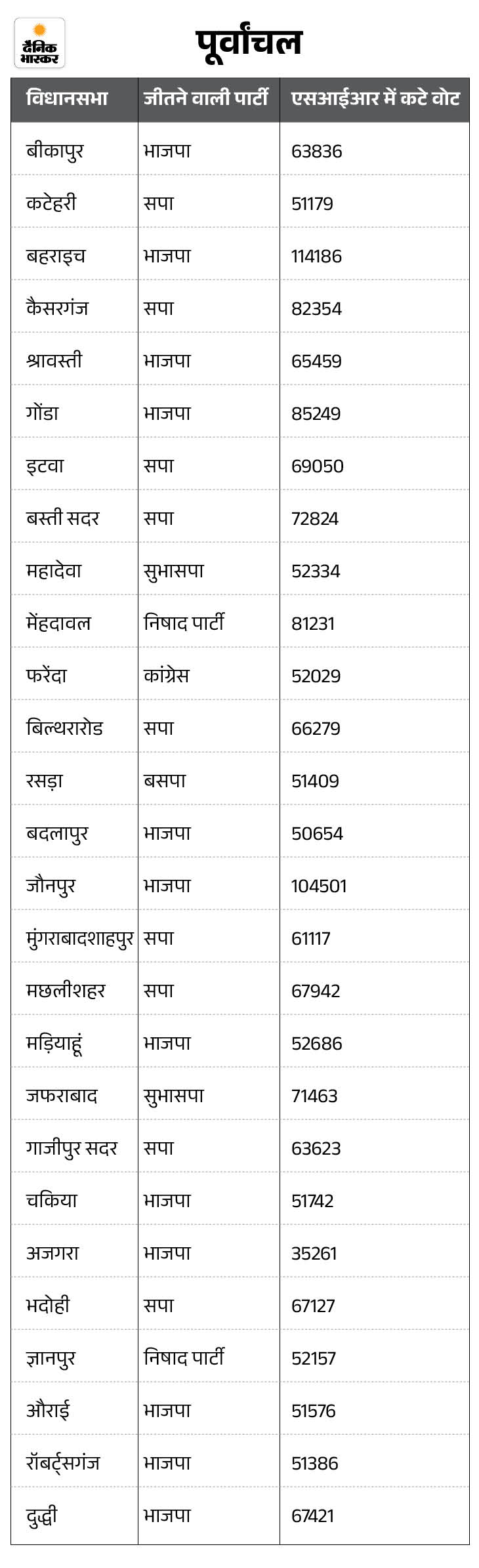 पूर्वांचल में भाजपा गठबंधन को नुकसान की आशंका पूर्वांचल में 27 सीटों पर जीत–हार का मार्जिन 10 हजार से कम था। 2022 में सपा ने सुभासपा के साथ मिलकर चुनाव लड़ा था और यहां यह गठबंधन प्रभावी साबित हुआ था। कम मार्जिन वाली सीटों पर भी बराबरी की टक्कर देखने को मिली थी। इन 27 सीटों में भाजपा ने 12 और सपा ने 9 सीटों पर जीत दर्ज की थी, जबकि सुभासपा और निषाद पार्टी को 2–2 तथा बसपा और कांग्रेस को 1–1 सीटें मिली थीं।