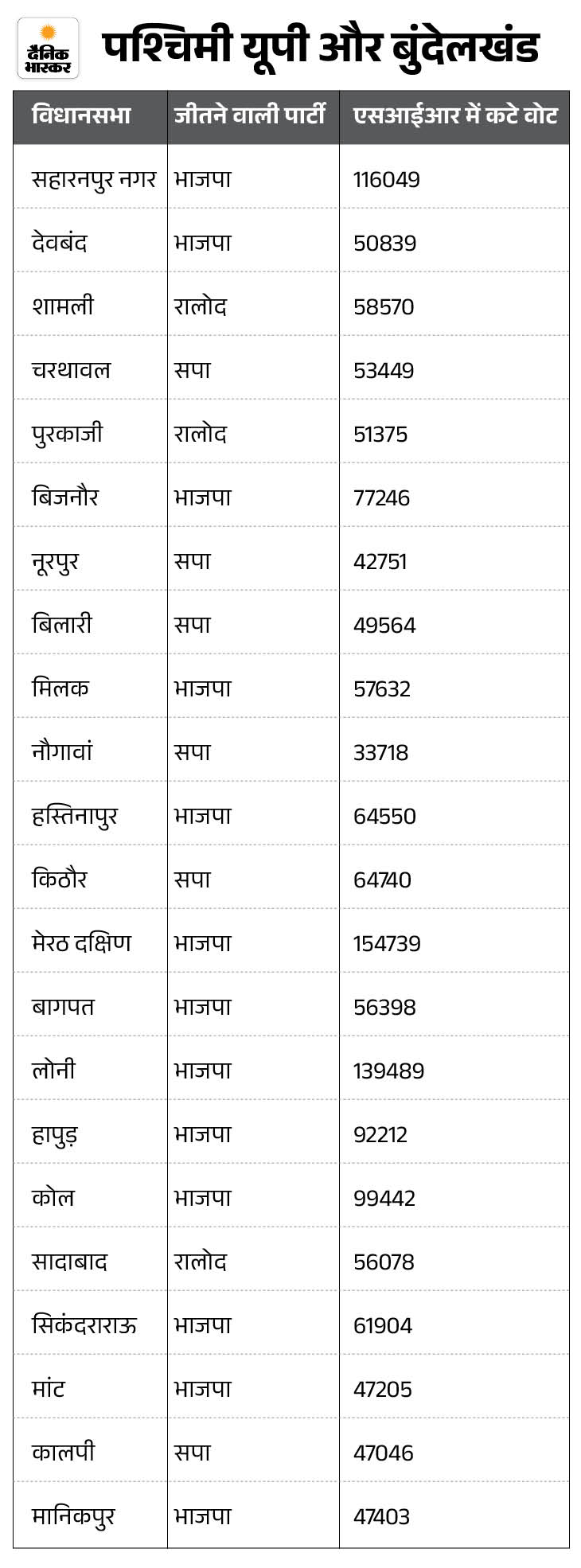2022 में 15 सीटों पर एक हजार से भी कम था मार्जिन यूपी में 2022 के विधानसभा चुनाव परिणामों पर नजर डालें तो 15 सीटें ऐसी थीं, जहां जीत–हार का मार्जिन एक हजार से भी कम था। इनमें से 10 सीटों पर तो परिणाम 500 से भी कम वोटों के अंतर से तय हुआ था। इन 15 सीटों में 9 पर भाजपा और उसके सहयोगी दलों ने जीत दर्ज की थी, जबकि 6 सीटों पर सपा गठबंधन भारी पड़ा था। अब इन सीटों पर 32 हजार से लेकर 1.12 लाख तक वोट कट चुके हैं।