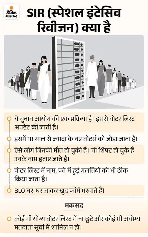 SIR के प्रोसेस को 5 सवाल-जवाब में जानें 1. SIR क्या है – यह चुनाव आयोग की एक प्रक्रिया है। इसमें वोटर लिस्ट अपडेट की जाती है। इसमें 18 साल से ज्यादा के नए वोटर्स को जोड़ा जाता है। ऐसे लोग जिनकी मौत हो चुकी है या जो शिफ्ट हो चुके हैं, उनके नाम हटाए जाते हैं। वोटर लिस्ट में नाम, पते में हुई गलतियों को भी ठीक किया जाता है। BLO घर-घर जाकर खुद फॉर्म भरवाते हैं।