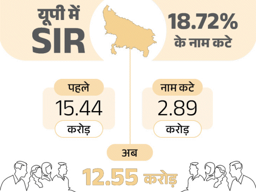 - इसके बाद 6 जनवरी को ड्राफ्ट लिस्ट जारी की गई। 2.89 करोड़ नाम कट गए। इनमें 46.23 लाख मृत, 2.17 करोड़ लोग शिफ्टेड और 25.47 लाख डुप्लीकेट वोटर शामिल हैं। पहले प्रदेश में 15.44 करोड़ वोटर थे, अब 12.55 करोड़ मतदाता बचे हैं। मतलब- हर पांचवां वोटर लिस्ट से बाहर हो गया है।