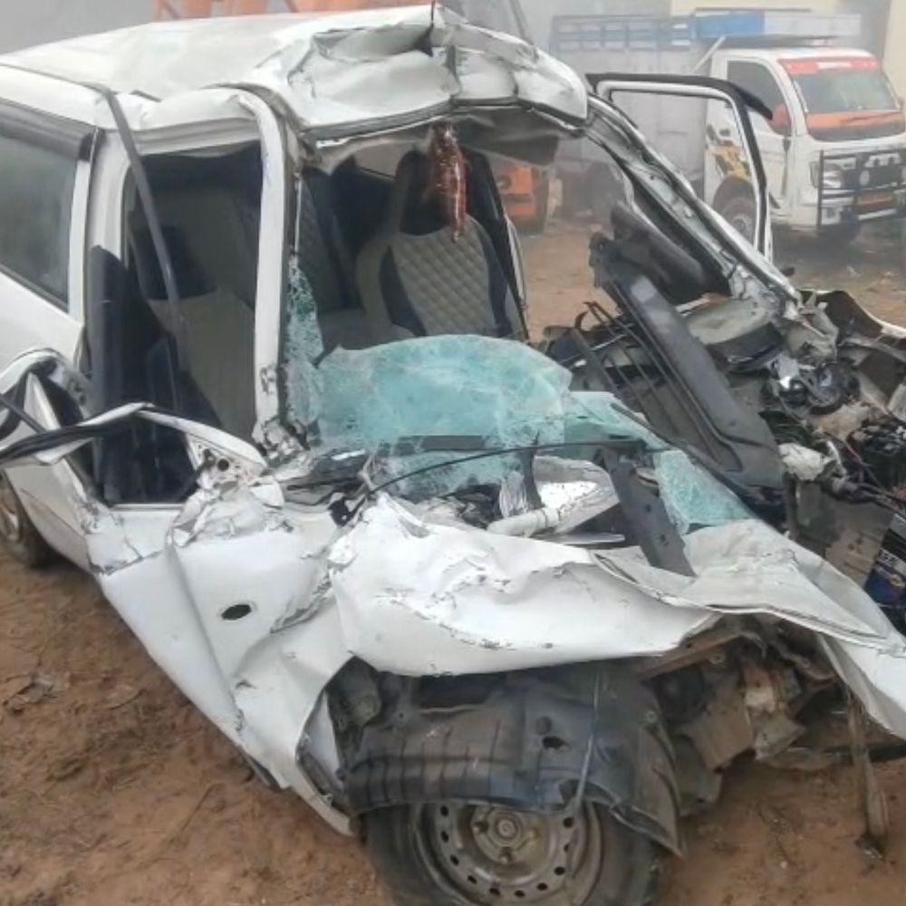 धौलपुर में नेशनल हाईवे संख्या 44 पर ट्रक की टक्कर से क्षतिग्रस्त हुई वैगनार कार।