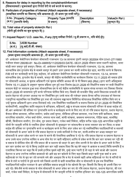 शिकायत के अनुसार, 7 जनवरी 2026 को नवनिर्वाचित पदाधिकारी और सदस्य बाबा साहेब डॉ. भीमराव अंबेडकर की प्रतिमा पर पुष्पांजलि अर्पित करने एवं कार्यग्रहण के लिए सोसायटी परिसर पहुंचे थे। इसी दौरान एफआईआर में नामजद पूर्व DGP रवि प्रकाश मेहरड़ा, प्रशांत मेहरड़ा और अन्य लोग अपने समर्थकों के साथ सोसायटी के मुख्य गेट पर पहुंचे और नवनिर्वाचित पदाधिकारियों व सदस्यों को अंदर जाने से रोक दिया।