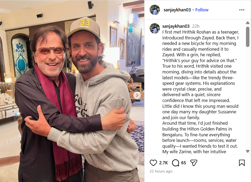 इंस्टाग्राम पर शेयर किए गए एक नोट में वो लिखते हैं- “मैं पहली बार ऋतिक रोशन से जायद के जरिए मिला था। उस वक्त वो टीनएजर थे। उस समय मुझे सुबह की राइड के लिए एक नई साइकिल की जरूरत थी। मैंने जायद से कैजुअली इसका जिक्र किया। उसने मुस्कुराते हुए कहा कि इस बारे में सही सलाह के लिए ऋतिक ही सही इंसान हैं।