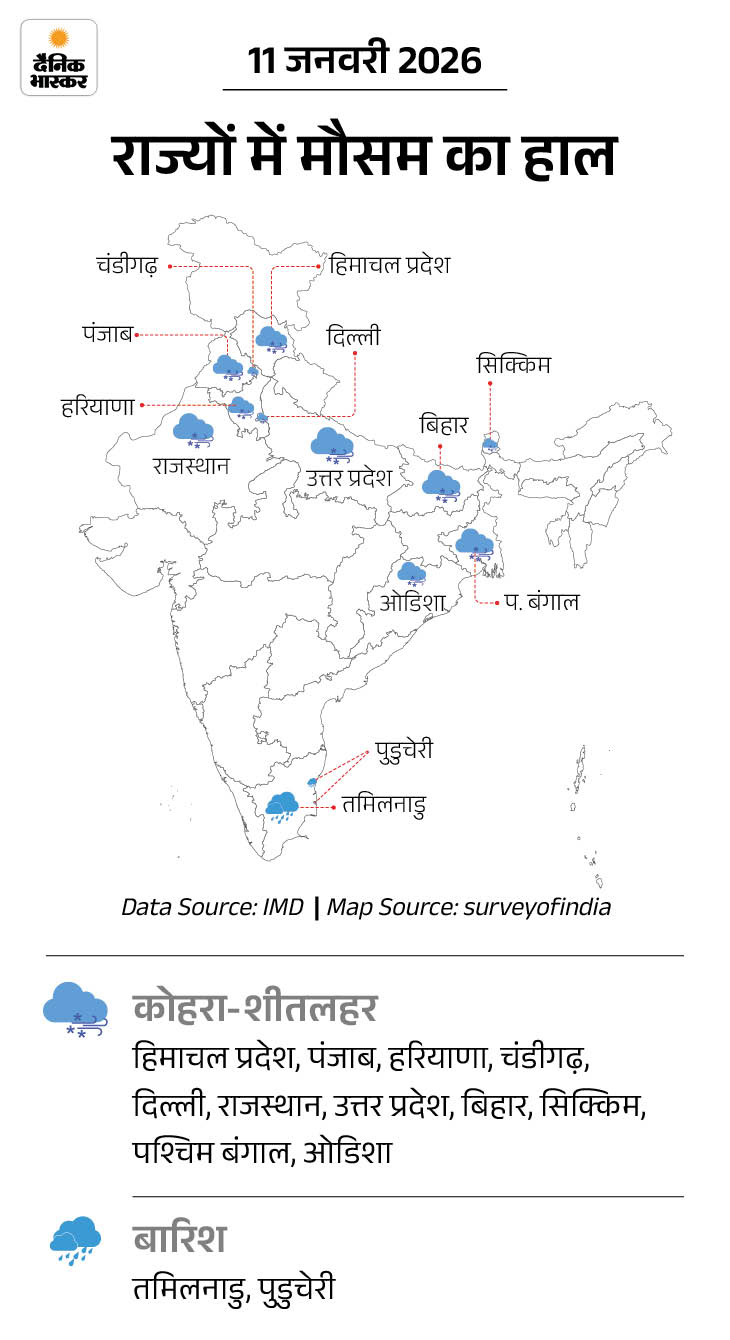 उत्तर प्रदेश, राजस्थान, बिहार, मध्य प्रदेश, झारखंड, छत्तीसगढ़, पंजाब, हरियाणा में कोहरे के साथ हल्की बारिश का अलर्ट।