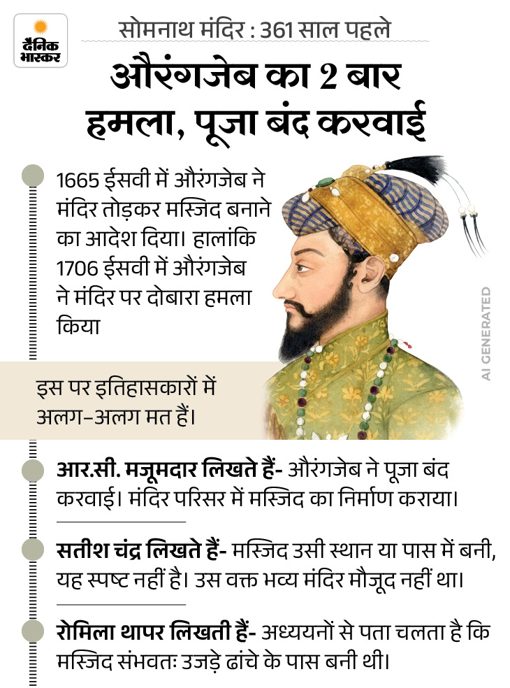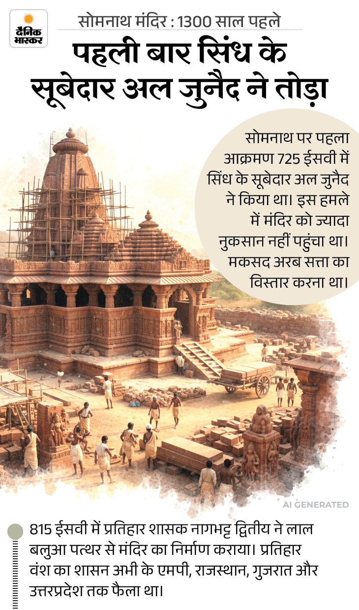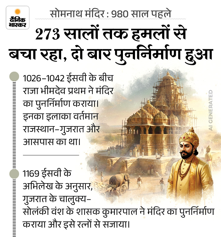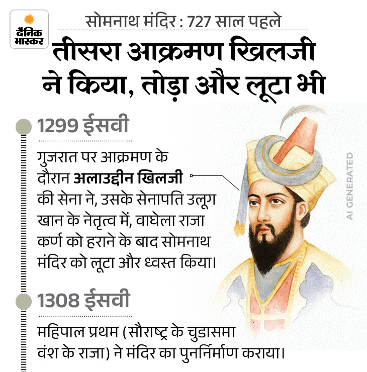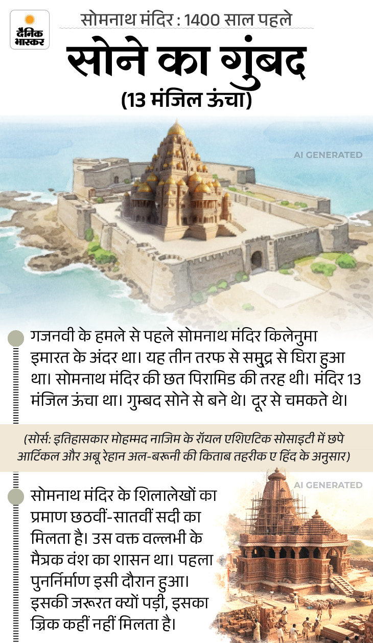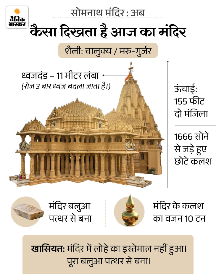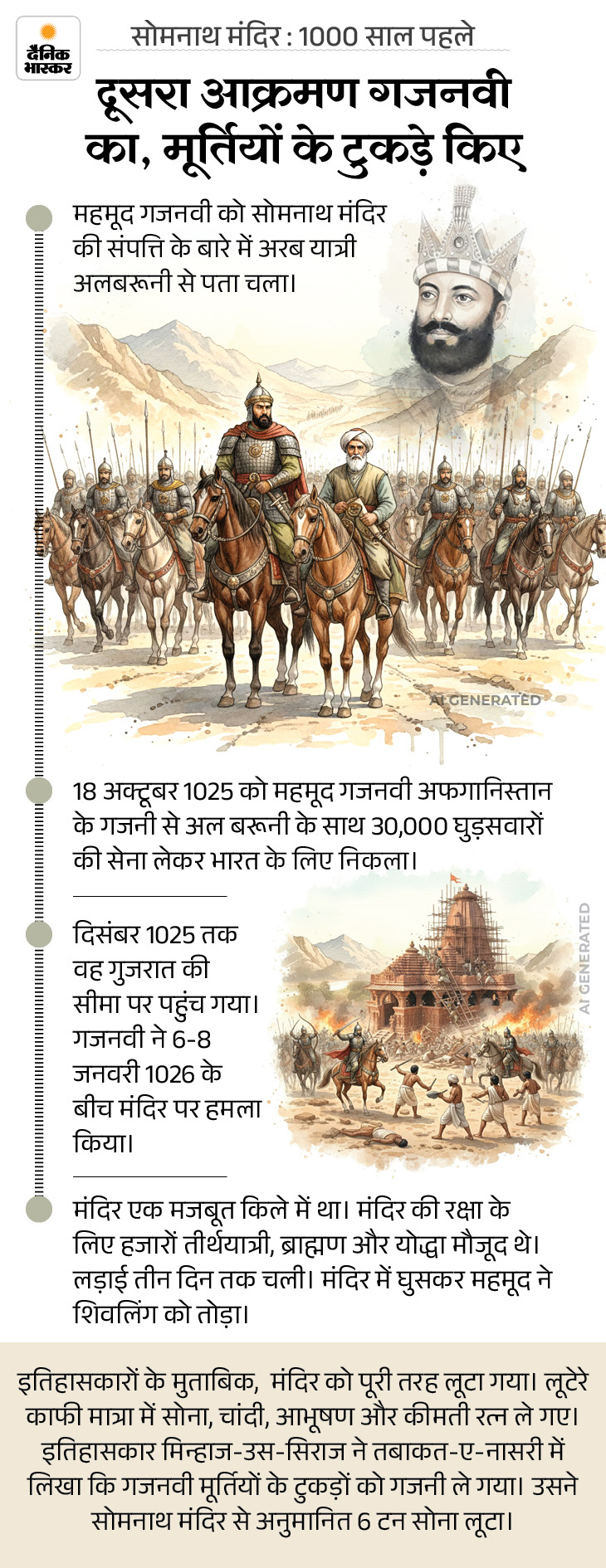 2026 गुजरात के सोमनाथ मंदिर के लिए 2 वजहों से अहम है। साल 1026 में महमूद गजनवी ने मंदिर पर हमला कर ध्वस्त कर दिया था, जिसके 1000 साल पूरे हो रहे हैं। वहीं दूसरी ओर, 11 मई 1951 को स्वतंत्र भारत में पुनर्निर्मित सोमनाथ मंदिर की प्राण प्रतिष्ठा के 75 वर्ष हो गए हैं। पीएम मोदी ने ‘सोमनाथ स्वाभिमान पर्व’ नाम दिया है।
