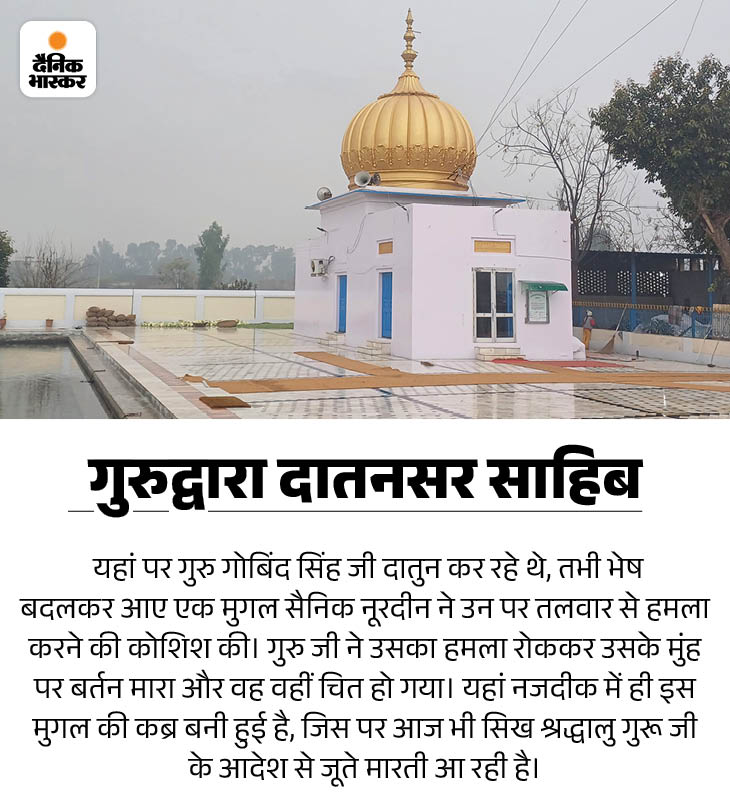 मुगलों का जासूस था नूरदीन, वेश बदलकर गुरुजी की सेना में आया: भाजपा के सिख नेता तेजिंदर पाल सिंह बग्गा ने अपने X अकाउंट पर लिखा- मुगल युद्ध के मैदान में गुरु गोबिंद सिंह जी का मुकाबला नहीं कर सकते थे इसलिए उन्होंने नूरदीन को सिख के वेश में गुरु जी की सेना में शामिल करवा दिया। एक दिन जब गुरु गोबिंद सिंह जी दातुन कर रहे थे तो उसने पीछे तलवार से गुरु जी पर हमला कर दिया। गुरु जी के पास लोटा था, जिसे उन्होंने नूरदीन के सर पर दे मारा जिससे उसकी मौके पर ही मौत हो गई। उस स्थान पर अब गुरुद्वारा दातनसर है और गुरुद्वारे से कुछ ही दूरी पर मुगल नूरदीन की कब्र है, जो भी संगत गुरुद्वारे आती है वो नूरदीन की कब्र पर 5-5 बार चप्पल-जूते मारती है।