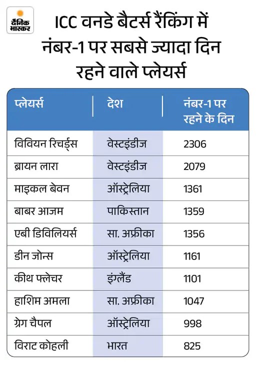 तीसरे नंबर पर हैं कोहली 14 जनवरी को ICC ने विराट कोहली से जुड़ा एक डाटा सोशल मीडिया पर साझा किया था, जो बाद में गलत साबित हुआ। गलती सामने आने के बाद ICC ने उस कॉपी को सुधार दिया। पहले ICC ने बताया था कि विराट कोहली कुल 825 दिनों तक वनडे रैंकिंग में नंबर-1 स्थान पर रहे हैं, जिसके आधार पर वे इस सूची में दुनिया में 10वें स्थान पर थे।