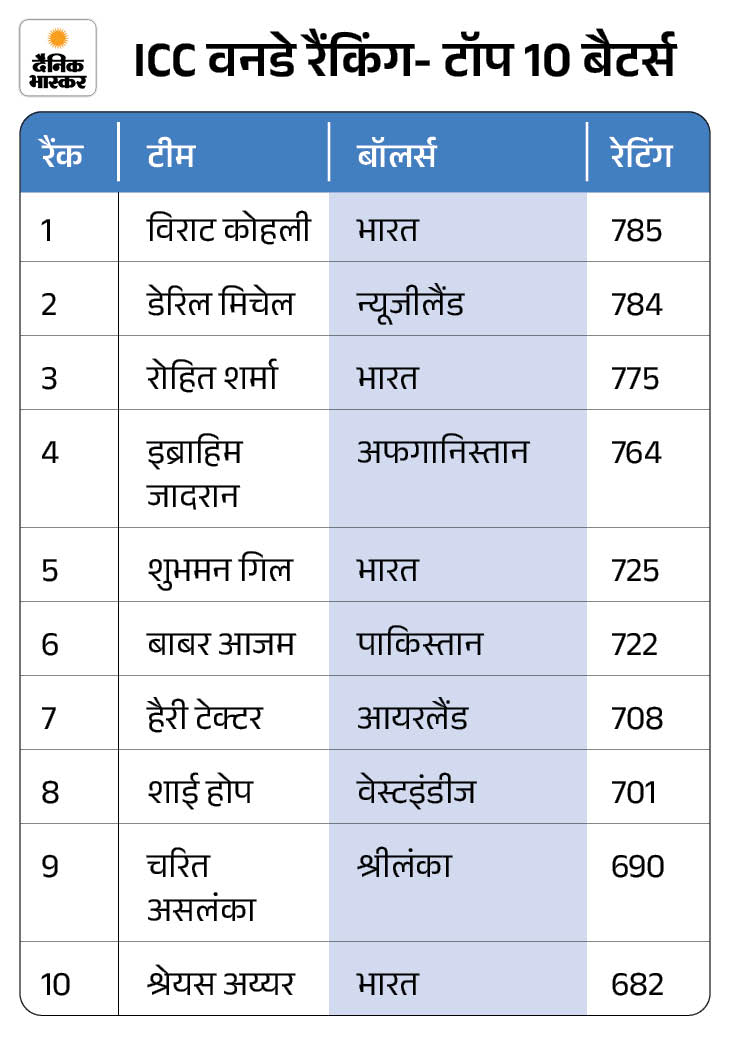 विराट वनडे में 11वीं बार नंबर-1 विराट ने न्यूजीलैंड के खिलाफ पहले वनडे में 93 रन की पारी खेली थी, इसका उन्हें सीधा फायदा मिला। ​उनके अब 785 रेटिंग पॉइंट्स हो गए हैं। विराट जुलाई 2021 के बाद पहली बार और ओवरऑल अपने करियर में 11वीं बार नंबर-1 वनडे बल्लेबाज बने हैं। पिछले हफ्ते वे नंबर-2 पर थे। उन्होंने रोहित शर्मा को पीछे छोड़ा।