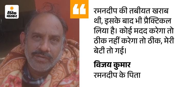 पिता ने बताया- 16 जनवरी को फिर से बायोलॉजी प्रैक्टिकल के लिए फिर दबाव डाला गया। जिसके बाद रमनदीप को तबीयत खराब होने के बावजूद दूसरी मंजिल पर ले जाया गया। प्रैक्टिकल पूरा कर लैब से निकलते ही रमनदीप को चक्कर आया और वह सीढ़ियों बालकनी से नीचे ग्राउंड फ्लोर पर गिर गई।