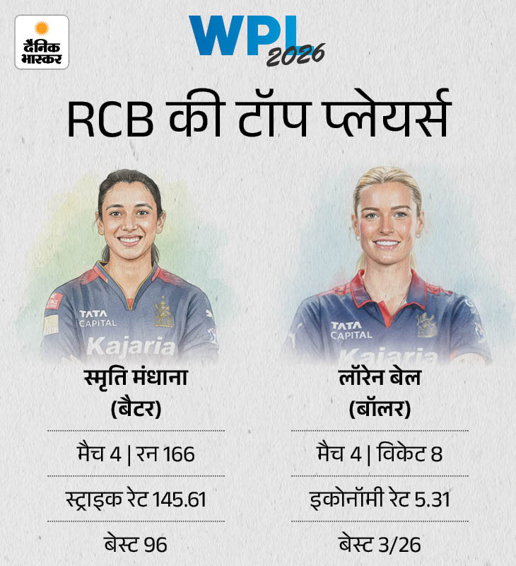 मंधाना टीम की टॉप स्कोरर WPL 2026 में रॉयल चैलेंजर्स बेंगलुरु के लिए स्मृति मंधाना शानदार फॉर्म में नजर आ रही हैं। उन्होंने 4 मैचों में 166 रन बनाए हैं, जिसमें उनका बेस्ट स्कोर 96 रन का रहा है। मंधाना टीम की टॉप स्कोरर हैं। उन्होंने पिछले मैच में DC के खिलाफ 96 रन बनाए थे। वहीं गेंदबाजी में लॉरेन बेल ने टीम के लिए सबसे ज्यादा विकेट लिए हैं। उन्होंने 4 मैचों में 8 विकेट चटकाए हैं।