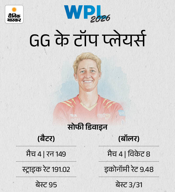डिवाइन का ऑलराउंड प्रदर्शन WPL 2026 में RCB के लिए सोफी डिवाइन ऑलराउंड प्रदर्शन कर रही हैं। बल्लेबाजी में उन्होंने 4 मैचों में 149 रन बनाए हैं। वहीं, गेंदबाजी में भी डिवाइन ने शानदार प्रदर्शन किया है। उन्होंने 4 मैचों में 8 विकेट लिए हैं। डिवाइन टीम की टॉप स्कोरर और टॉप विकेट टेकर हैं।