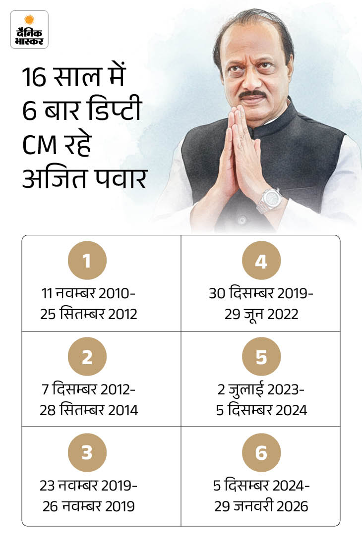 अजित पवार का निधन बुधवार सुबह 8.45 बजे हुआ, जब बारामती एयरपोर्ट पर लैंडिंग के दौरान उनका चार्टर्ड प्लेन क्रैश हुआ था। हादसे में पवार के सुरक्षाकर्मी, दो पायलट और एक महिला क्रू समेत 5 लोगों की मौत हुई।