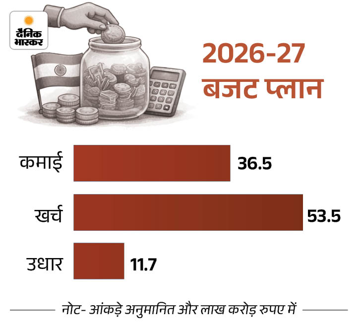 अगले साल कुल कमाई ₹36.5 लाख करोड़ रहने का अनुमान सरकार ने ₹36.5 लाख करोड़ कुल कमाई का अनुमान है। जिसमें टैक्स से ₹28.7 लाख करोड़ आएंगे। वहीं लगभग ₹53.5 लाख करोड़ कुल खर्च रहने का अनुमान है। खर्च कमाई से ज्यादा है, इसलिए सरकार बाजार से ₹11.7 लाख करोड़ का उधार लेगी। बाकी पैसा छोटी बचत योजनाओं से आएगा।