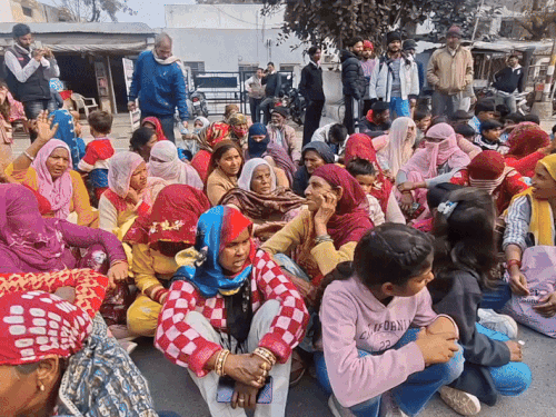 श्रीगंगानगर में कलेक्ट्रेट के बाहर महिलाओं का विरोध-प्रदर्शन:कहा- प्रशासन हमारे आशियाने उजाड़ने में लगा, आंदोलन चेतावनी दी