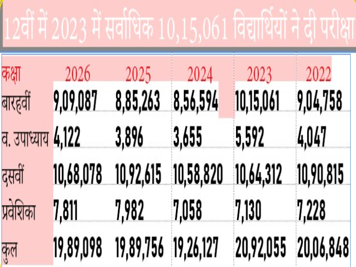 बारहवीं कक्षा में पिछले साल 8,85,263 विद्यार्थी रजिस्टर्ड हुए थे। इनकी संख्या बढकर इस साल 9,09,087 तक पहुंच गई। इसी तरह से दसवीं कक्षा में पिछले साल 10,92,615 विद्यार्थी थे। इनकी संख्या इस साल घटकर 10,68,078 रह गई है। संयुक्त निदेशक कार्यालय और जिला शिक्षा अधिकारी कार्यालय में 9 फरवरी से कंट्रोल रूप प्रारंभ होगा। यह परीक्षा समाप्ति तक काम करेगा। प्रश्न पत्रों का वितरण 4 या 5 फरवरी को हो सकता है।