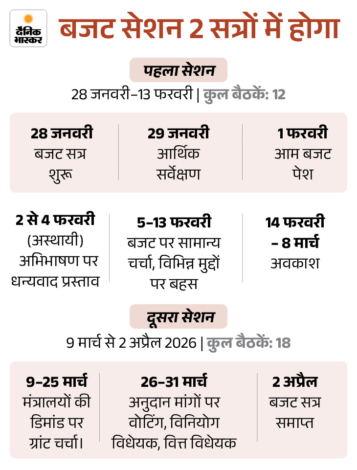 बजट सत्र 65 दिनों में 30 बैठकों तक चलेगा। यह 2 अप्रैल को खत्म होगा। 28 जनवरी से शुरू हुआ पहला चरण 13 फरवरी को खत्म होगा। इसके बाद दूसर चरण 9 मार्च को शुरू होगा।