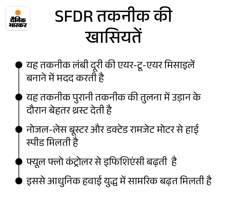 यह तकनीक लंबी दूरी की हवा से हवा में मार करने वाली मिसाइलें बनाने में मदद करती है। इस तकनीक से संभावित विरोधियों के मुकाबले रणनीतिक बढ़त मिलती है। परीक्षण के दौरान सभी प्रमुख उप-प्रणालियों ने अपेक्षा के अनुरूप प्रदर्शन किया। इनमें बिना नोजल वाला बूस्टर, सॉलिड फ्यूल डक्टेड रामजेट मोटर और फ्यूल फ्लो कंट्रोलर शामिल थे।