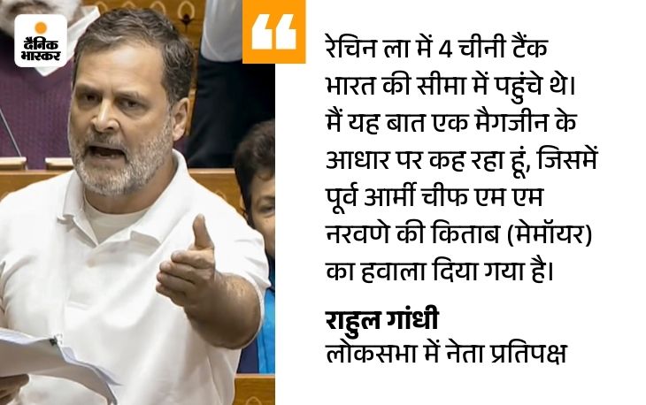 राहुल ने पूर्व आर्मी चीफ जनरल नरवणे की अनपब्लिश्ड बुक का हवाला देते हुए कहा है कि 31 अगस्त 2020 को 4 चीनी टैंक लद्दाख बॉर्डर के पास पहुंच गए थे। राहुल के ऐसा कहते ही पहले रक्षा मंत्री राजनाथ सिंह और फिर गृह मंत्री शाह ने उन्हें टोका था।