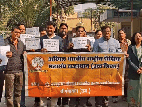 चौधरी बल्लूराम गोदारा राजकीय कन्या महाविद्यालय, श्रीगंगानगर में अखिल भारतीय राष्ट्रीय शैक्षिक महासंघ की ओर से कॉलेजों में संविदा पर नियुक्तियां करने के विरोध में विरोध-प्रदर्शन किया गया।शिक्षकों ने प्रस्तावित चयन प्रक्रिया पर तत्काल रोक लगाने, सोडाणी समिति की सिफारिशों को लागू करने और सभी राज-सीईएस महाविद्यालयों को सामान्य राजकीय महाविद्यालयों की तरह संचालित करने की मांग की। संगठन के प्रदेश सचिव प्रो. श्याम लाल ने कहा- राज-सीईएस योजना के तहत संचालित महाविद्यालयों का वर्तमान स्वरूप NEP-2020 की मूल भावना के खिलाफ है। यहां स्थायी अकादमिक ढांचे का अभाव है, अधोसंरचना और संसाधन अपर्याप्त हैं, शोध-नवाचार की कोई गुंजाइश नहीं और पूरी अध्यापन व्यवस्था संविदा एवं अस्थायी शिक्षकों पर टिकी है। इससे उच्च शिक्षा की गुणवत्ता, बहुविषयकता और अकादमिक निरंतरता खतरे में पड़ रही है। उन्होंने कहा- सत्र 2020-21 से 2022-23 के बीच 303 नए महाविद्यालय खोले गए, जबकि वर्तमान सरकार के कार्यकाल में 2023-24 और 2024-25 में 71 अतिरिक्त जोड़े गए। अब कुल संख्या 374 पहुंच गई है। इनमें से करीब 260 महाविद्यालयों में आज भी एक भी स्थाई संकाय सदस्य नहीं है, जो NEP-2020 के प्रभावी क्रियान्वयन पर गंभीर सवाल खड़े करता है। प्रदर्शन के बाद संगठन के प्रतिनिधिमंडल ने उपखंड अधिकारी के माध्यम से मुख्यमंत्री, राज्यपाल और प्रधानमंत्री को अलग-अलग ज्ञापन सौंपे। ज्ञापन में सोडाणी समिति की सिफारिशों को तत्काल लागू करने की मांग की गई, जो विधानसभा चुनाव-2023 के बाद गठित हुई थी लेकिन अब तक सार्वजनिक नहीं की गईं। महासंघ ने भर्ती परीक्षा कैलेंडर-2026 के तहत राज-सीईएस नियम-2023 में बदलाव कर 5 साल के लिए 28,500 रुपये फिक्स वेतन पर संविदा टीचिंग एसोसिएट की भर्ती शुरू करने के प्रयास की कड़ी निंदा की। संगठन का कहना है कि यह व्यवस्था अस्थायी, असुरक्षित और नीति-विरोधी है। अधीनस्थ सेवा चयन बोर्ड को भेजी गई अभ्यर्थना को तत्काल रोका जाए। यदि समय रहते कोई फैसला नहीं लिया गया तो संगठन लोकतांत्रिक और आंदोलनात्मक कदम उठाने को मजबूर होगा, जिसकी जिम्मेदारी शासन-प्रशासन की होगी।
