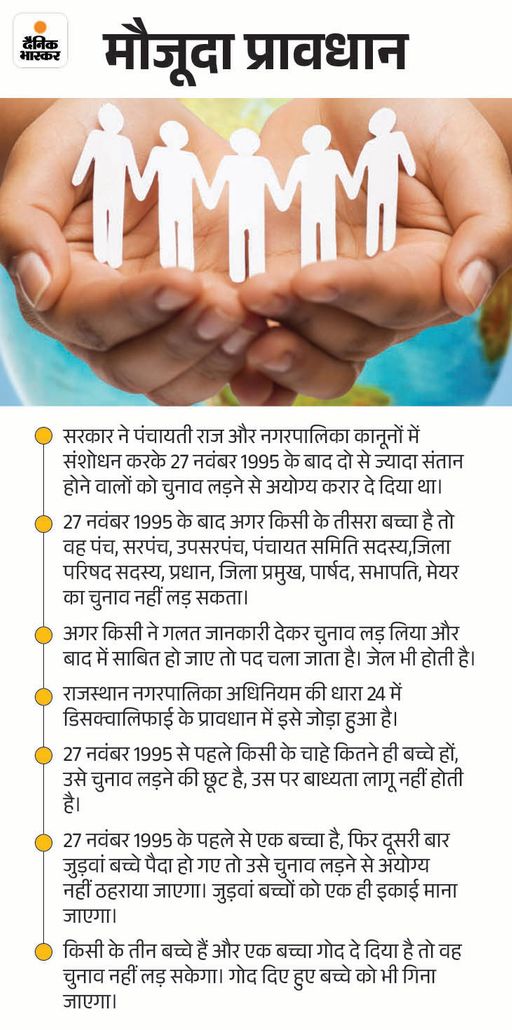 साल 1994-95 में लगी थी रोक 1994-95 में तत्कालीन मुख्यमंत्री भैरोंसिंह शेखावत की सरकार में राजस्थान पंचायती राज अधिनियम, 1994 बना था। इसके मुताबिक जिन जनप्रतिनिधियों के दो से अधिक बच्चे होंगे, वो पंचायत और निकाय चुनाव नहीं लड़ पाएंगे। इसमें चुनाव जीतने के बाद तीसरा बच्चा पैदा होने पर पद से हटाने का भी प्रावधान किया गया था। तब से अब तक इसमें कोई शिथिलता नहीं दी गई है।