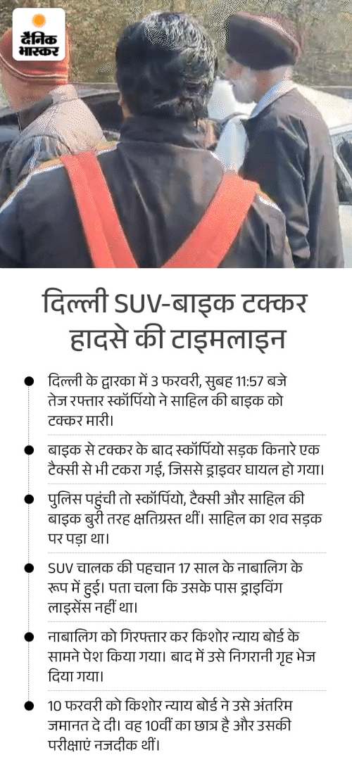 दिल्ली में 3 फरवरी को एक स्कॉर्पियो की टक्कर से 23 साल के साहिल धनेशरा की मौत हो गई थी। कार चलाने वाला नाबालिग है।