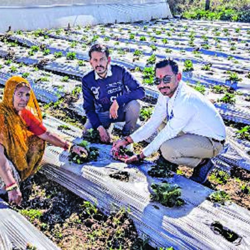 सादड़ी क्षेत्र की 62 वर्षीय किसान हंजा देवी मेघवाल जिले की ऐसी पहली किसान हैं, जो खुले खेत (बिना पॉलीहाउस) स्ट्रॉबेरी की खेती कर रही हैं। जिले में अधिकतर किसान स्ट्रॉबेरी को केवल पॉलीहाउस या शेडनेट में उगा रहे हैं, लेकिन हंजा देवी ने कृषि पर्यवेक्षक बेटे नरेश की सलाह से यह प्रयोग किया, इन्हें खुले में उगाया। स्थानीय जलवायु के अनुकूल किस्म चयन कर उचित मल्चिंग, सिंचाई, पोषण प्रबंधन और कम लागत में ज्यादा मुनाफा देने वाली फसल का चयन किया। भीलवाड़ा की नर्सरी से स्ट्रॉबेरी की पौध लेकर आए। उन्होंने बताया कि ट्रायल के आधार पर पहली बार 20 अक्टूबर को एक हजार स्ट्रॉबेरी के पौधे लगाए थे। अभी तक 900 पौधे जिंदा हैं। पौधों से फल का उत्पादन भी शुरू कर दिया है। रोजाना 7 से 10 किलो तक फल तोड़कर बेच रहे हैं। हंजा देवी ने बताया कि पूरी फसल में केवल जैविक खाद का ही उपयोग किया गया है। इसमें जीवामृत, नीम तेल, वर्मी कम्पोस्ट ही डाल रहे हैं। फसल में पेस्टीसाइड और इनसेक्टीसाइड का उपयोग बिलकुल भी नहीं किया गया है। यह फसल मार्च तक रहेगी। जनवरी में ही बाजार में स्ट्रॉबेरी बेचना शुरू कर दिया था। अब एकड़ में लगाएंगे फसल वे बताती हैं कि स्ट्रॉबेरी के छोटे आकार के फल 150 रुपए प्रति किलो और बड़े आकार के फल 300 रुपए किलो तक बाजार में बिक जाते हैं। प्रयोग सफल रहा और मुनाफा बढ़ा है, इसलिए अगली बार एक एकड़ क्षेत्र में खुले में स्ट्रॉबेरी की फसल लगाएंगे। दूसरी ओर हंजा देवी ने उद्यान विभाग द्वारा 95 प्रतिशत अनुदान पर लगाए गए दो एकड़ के शेडनेट हाउस में खीरे की फसल लगा रखी है। मई से सितंबर के 100 दिनों में 2 एकड़ में खीरे की फसल लगाई। इनमें 8 लाख की लागत आई। वहीं, 100 दिन की फसल से 13 लाख के खीरे की फसल बेची। इसके बाद फिर से अक्टूबर में 2 एकड़ में 4.5 लाख की लागत से खीरे की फसल लगाई। उसमें से अब तक 5 लाख की बेच चुकी हैं। यह फसल मार्च के पहले सप्ताह तक चलेगी। तब तक 21 लाख से अधिक की फसल बेच चुके होंगे। इसमें लागत 12 से 13 लाख की हो जाएगी। हंजा देवी ने बताया कि शेडनेट संरचना के कारण तापमान व आर्द्रता का संतुलन तो होता ही है कीट एवं रोग का प्रकोप भी कम होता है।